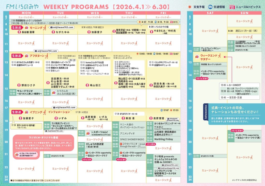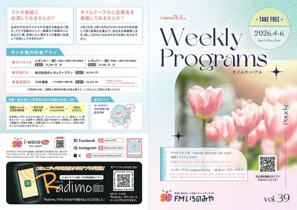 2026年3月27日 / 最終更新日時 : 2026年3月27日 iwave765 FMいちのみやからのお知らせ 【4月~タイムテーブル】 4月~のタイムテーブルが完成しました。紙のタイムテーブルは、順次配布予定です。 Follow me! @iwave765 Facebooktwitter